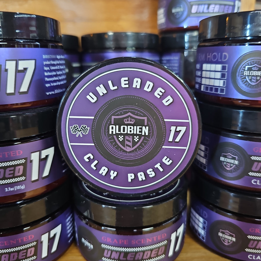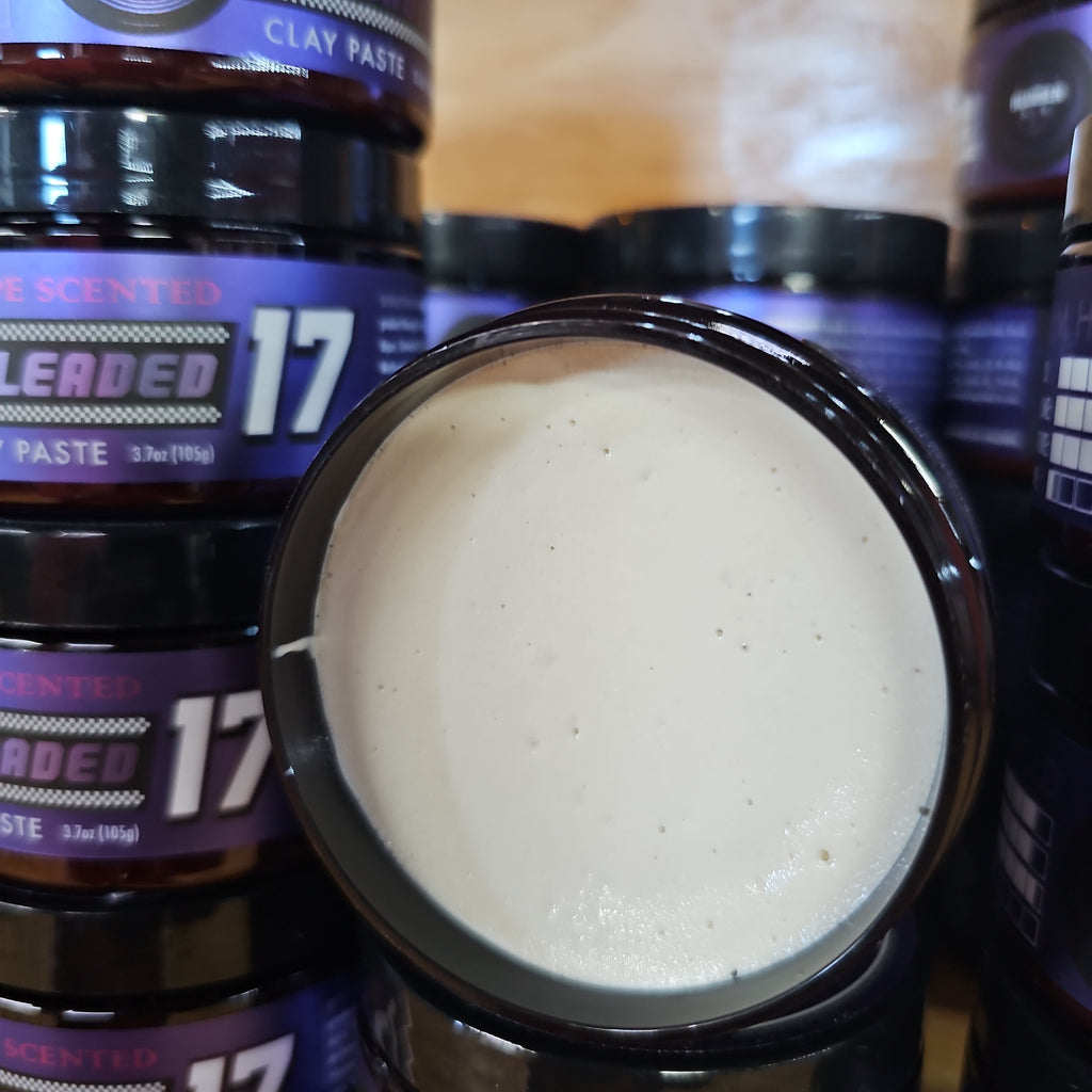 Our flagship styling product , unleaded 17 is a clay paste with firm hold and little shine. This clay and paste mix has a Grape ethanol race car fuel scent (without the real ethanol smell of course haha).